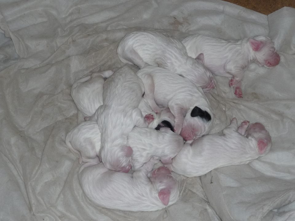 Druhé následovalo, když jsme se 16. června jeli nezávazně podívat na štěňátka. Chtěli jsme se jen mrknout na malé bílé kuličky a trochu je pomuchlat. Skončilo to tak, že jsme odjížděli s hlavou plnou jednoho štěněte. Prcka s tmavě tečkovanou hlavou, který byl všude první, hrnul se ke mně a nechal se mazlit a chovat a celkově byl neuvěřitelně přítulný.